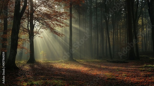 Magical forest scene with sunlight streaming through trees. Golden rays illuminate a carpet of autumn leaves on the forest floor. Mist and shadows create a enchanting atmosphere.