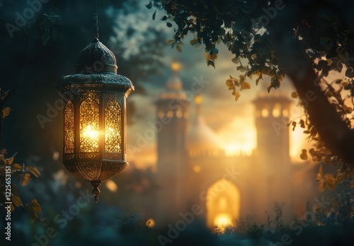 Magical Lantern Glowing in Twilight with Mystical Palace Background and Lush Greenery in a Dreamlike Atmosphere of Enchantment and Serenity