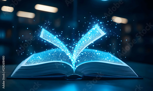 Magical Open Book with Glowing Sparkles in a Dim Library Setting