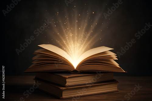 Magical Stack of Books with Radiant Light Representing Knowledge and Imagination