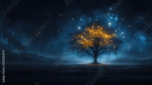 Magical tree glowing under a starlit night sky