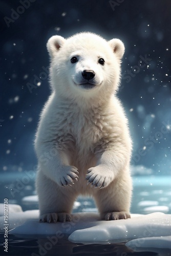 Magical white bear cub standing in the dark on an ice floe with snowy glow