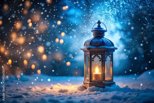 Magical Winter Night: Glowing Lantern & Falling Snowflakes - Long Exposure Stock Photo