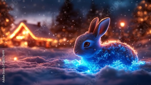 Magical Winter Wonderland with a Glowing Hare in Snow. Generative AI