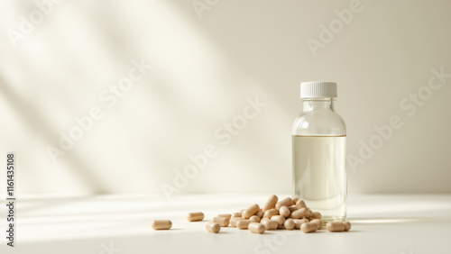 Magnesium Glycinate capsules in a dropper bottle on a white surface with light streaming through a window.