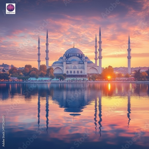 Magnificent Sunset Over Tranquil Water, with a Grand Mosques Reflection, Istanbul, Turkey.