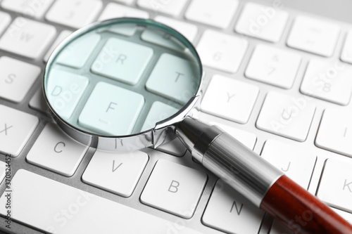 Magnifier glass on modern keyboard, closeup. Find keywords concept