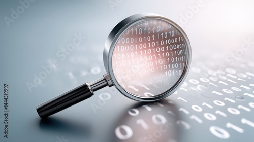 Magnifying glass highlighting binary code on soft pastel gradient background, tech research concept