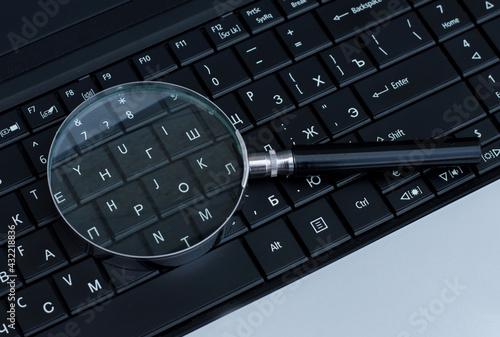 Magnifying Glass On A Black Notebook Keyboard - SEO Concept, Close Up