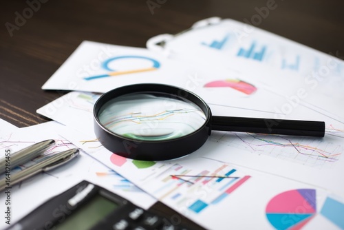 Magnifying glass on financial charts, symbolizing business analysis and research in detail.