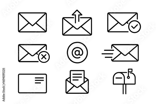 Mail and email line icon set. Communication outline icons for web design, app interface. Vector symbols for post, message, send, receive, newsletter, and contact.