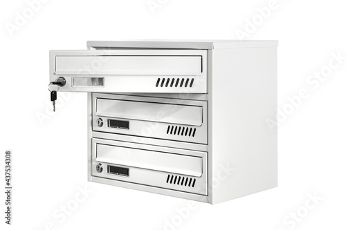 Mail boxes filled of leaflets and letters. Shallow DOF,Mailboxes and Lock in Rows at Entrance