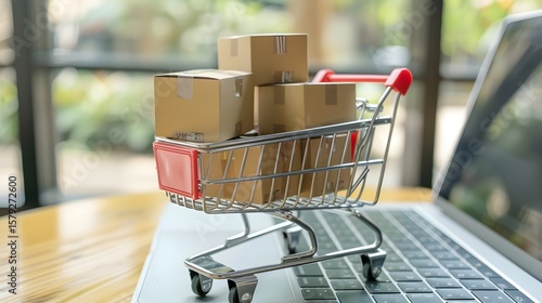 Mail cardboard boxes inside a miniature mini shopping cart on a laptop, e commerce, online shopping, buy online, sale, HD Background wallpaper