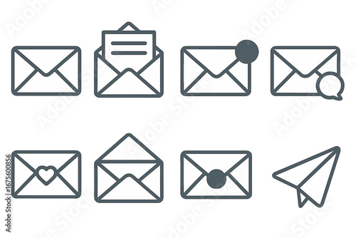 Mail icon set. Minimalist line art vector collection for email, message, and communication. Includes envelope, notification, chat bubble, sent message, and love letter symbols.
