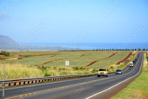 Main road through pineapple fields on the drive to the Northshore of Oahu in Hawaii
