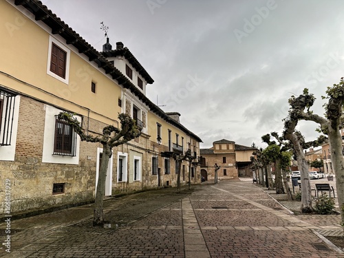 Main square of Fuentes de Nava in Palencia with historic facades and trimmed trees
