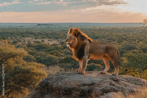 Majestic African Lion Stands on Rocky Outcrop at Sunset