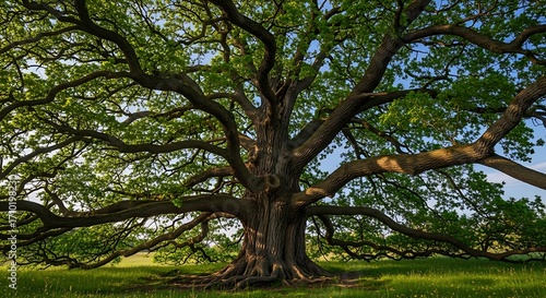 Majestic ancient oak tree with sprawling branches reaching towards the sky in a sunlit meadow