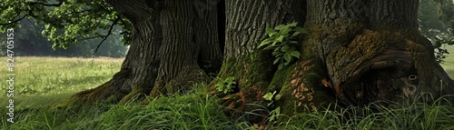 Majestic ancient tree trunks with dense moss and grass in a serene forest setting during daylight, showcasing nature's beauty and tranquility.