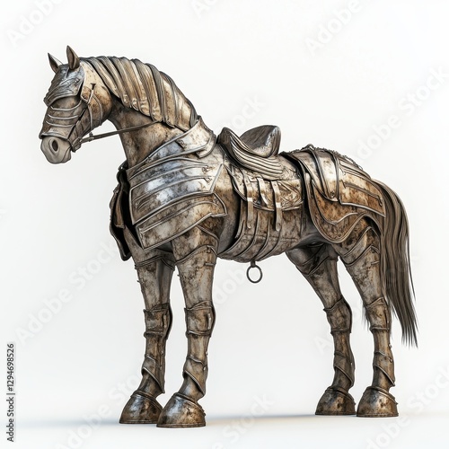 Majestic Armored War Horse in Profile Against a Crisp White Background - 3D Render of a Detailed Metal Creature