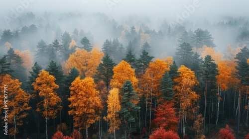 Majestic Autumn Forest With Colorful Trees Covered in Morning Fog. Generative AI