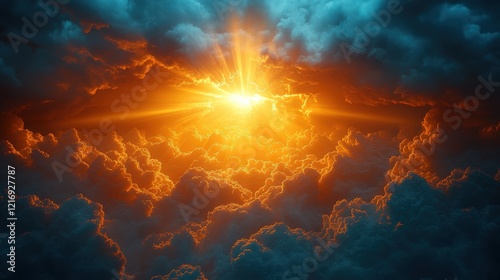 Majestic Background of Heaven with Bright Rays of Light Breaking through Dramatic Clouds Illuminated at Sunrise or Sunset