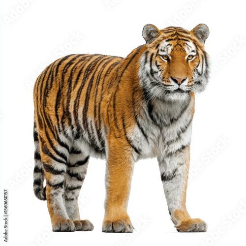 Majestic bengal tiger standing and looking forward with intense gaze isolated on white background