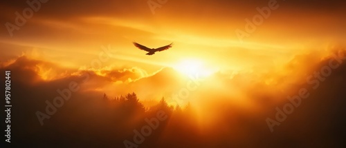 Majestic bird soaring through a golden sunset, surrounded by clouds and mountains, symbolizing freedom and tranquility.