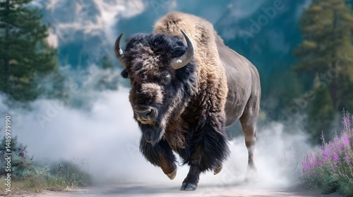 Majestic Bison Running Through a Misty Landscape with Forest and Mountains in Background