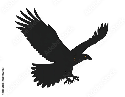 Majestic black eagle silhouette in flight, wings spread wide, talons extended.