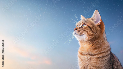 majestic cat with sleek, well groomed fur gazes thoughtfully at starry sky, evoking sense of wonder and tranquility
