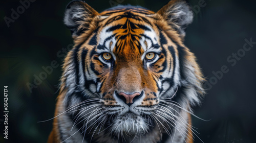 Majestic close-up portrait of a tiger featuring a direct stare and exquisite detail in its fur pattern against a dark background.