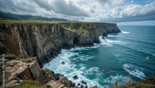 Majestic Coastal Cliffs with Waves Crashing Under Dramatic Sky