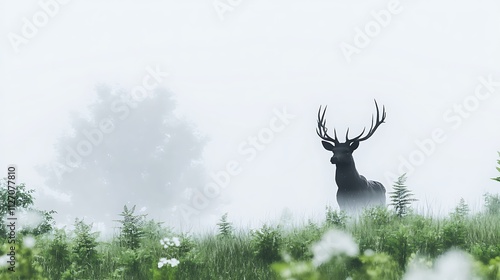Majestic Deer Silhouetted Against a Misty Sunrise in a Serene Landscape