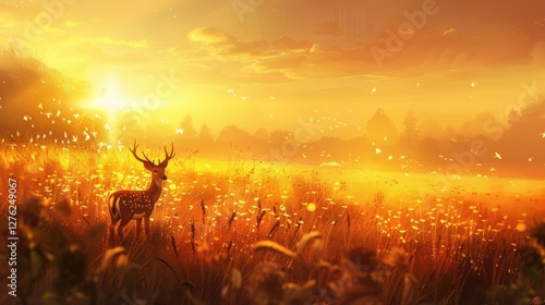 Majestic deer standing in a golden field at sunset, surrounded by soft sunlight and gentle breezes, evoking tranquility