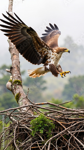 Majestic eagle takes flight from its nest among the trees in the foggy morning light