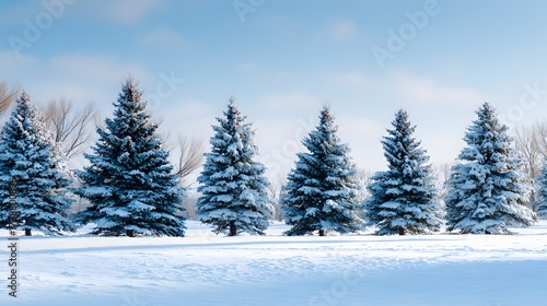 Majestic evergreen trees blanketed in pristine white snow stand in a row against a tranquil, clear, and azure winter sky, showcasing a scenic, snow-covered landscape with soft