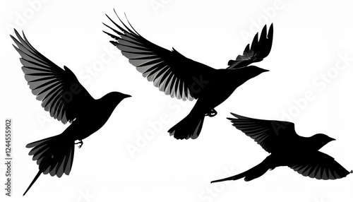 Majestic Flight of Silhouetted Birds Against a Minimalistic White Backdrop, Embracing the Essence of Avian Motion and Modern Artistry