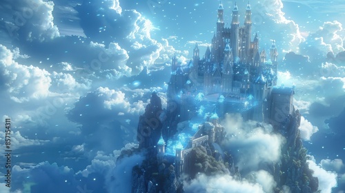 Majestic floating castle above the clouds with magical sparkling lights and a serene sky, depicting a fantasy world.