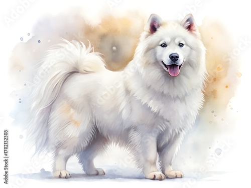 Majestic fluffy white samoyed dog with a happy expression and a soft watercolor background
