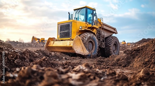 Majestic front view of a powerful yellow bulldozer at a construction site
