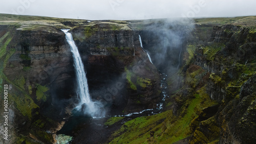 Majestic Haifoss waterfalls cascading into a lush green canyon in Iceland during overcast weather