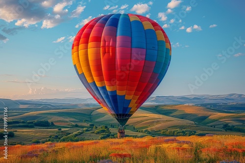 Majestic hot air balloon floating over vibrant flower fields with rolling hills in the background at sunset