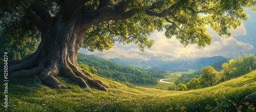 Majestic landscape featuring a large ancient tree with sprawling roots and a serene valley under a bright sky