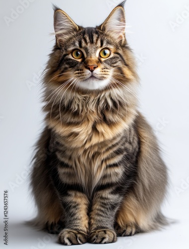 Majestic Maine Coon Cat with Striking Fur and Captivating Eyes Posing Gracefully Against a Soft White Background