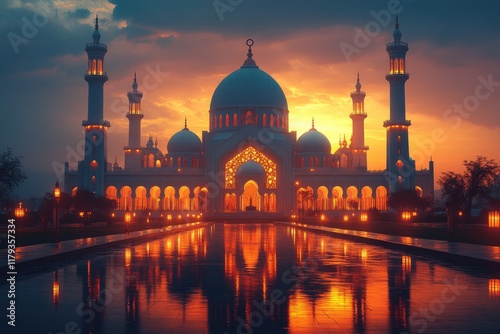 Majestic Mosque at Sunset Golden Hues Reflecting in Water