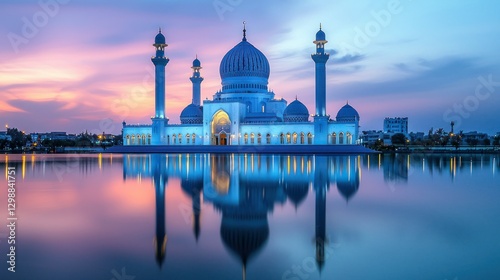 Majestic Mosque Reflecting in a Calm Evening Lake at Sunset