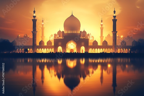 Majestic Mosque Sunset Golden Reflection Peaceful Serenity