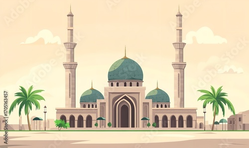 Majestic mosque with twin minarets and green domes, set against a warm desert sky with palm trees.