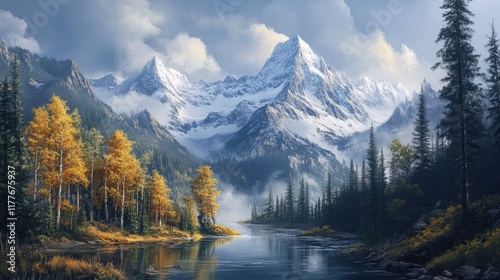 Majestic Mountain Landscape with Autumn Foliage and Reflective River in Serene Wilderness Setting